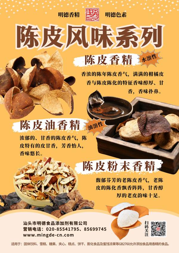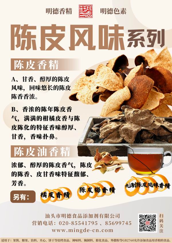 明德食品添加劑 緊跟市場(chǎng)潮流,應(yīng)運(yùn)而生 推出了 陳皮香精。愿使各位食品生產(chǎn)廠家朋友們更好的在新風(fēng)味浪潮中,占領(lǐng)市場(chǎng)先機(jī)優(yōu)勢(shì),永立潮頭。