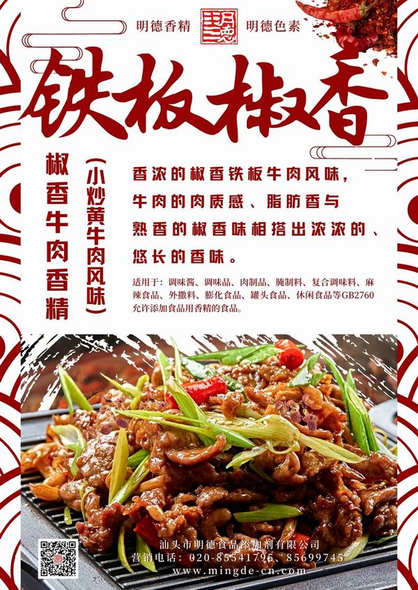 醬香、紅燒牛肉香精 肉香濃郁厚實;烤牛肉風味 烤香濃郁、脂肪香特征明顯;蒜香牛肉香精,蒜香十足,牛肉底韻濃厚;黑椒牛肉香精,椒香四溢,辛香肉香融合;鹵水牛肉香精 香味醇厚,讓人垂涎欲滴。明德 牛肉香精 香味濃郁悠長、耐溫性好(耐高溫)、適用性廣、風味醇厚。產品參數
