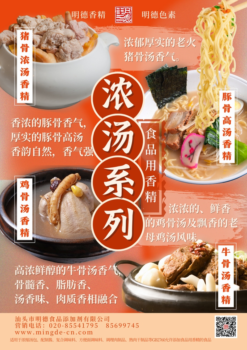明德濃湯風味系列香精 骨湯真韻 湯感醇厚汕頭市明德食品添加劑有限公司推出的濃湯系列香精,涵蓋豬骨濃湯、豚骨高湯、雞骨湯、牛骨湯等多種調(diào)性。產(chǎn)品真實還原老火熬煮的骨香與湯感層次,香氣厚實,留香穩(wěn)定。適用于調(diào)味料、復合調(diào)味料、濃縮湯包、方便面湯包、調(diào)理食品及肉制品等B端應用,幫助工廠快速打造統(tǒng)一、標準化的骨湯風味。